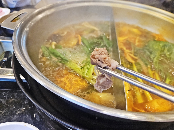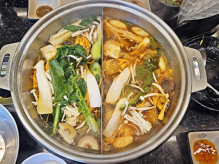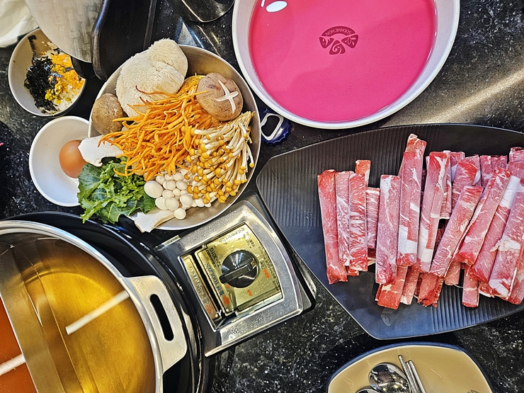 아름다운 항공 샷의 모습. 우리는 육수를 반반으로 주문했다. 육수에 버섯과 채소를 넣고 끓이다가 어느 정도 육수가 우러나왔다고 생각이 들면 고기를 넣어 맛있게 먹으면 된다. 채소를 육수에 넣는 사진도 찍었지만 올리기 귀찮으니 생략 하기로 한다.