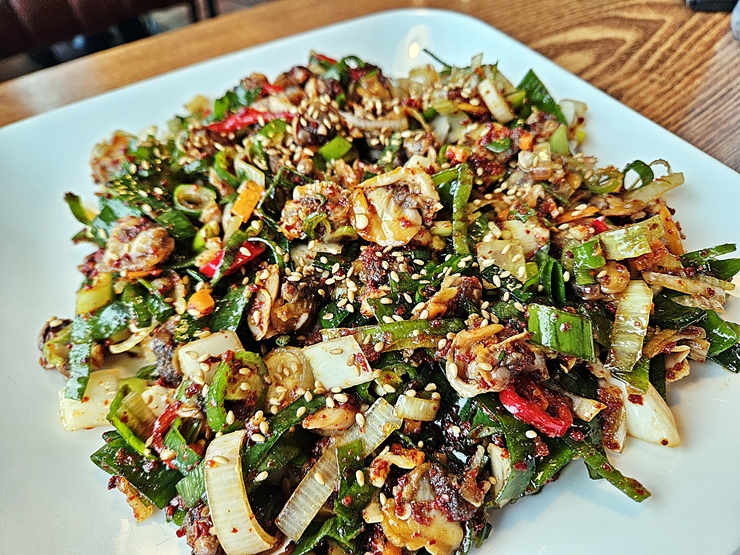 꼬막무침. 꼬막과 파를 아낌 없이 넣어 양념에 무친 것이다. 꼬막의 양이 적게 나올까 살짝 걱정했는데 꼬막도 굉장히 많이 들어 있었다. 요새 양심 없는 가게의 경우 어쩌고 무침이라고 팔면서 어쩌고는 찾아보기 어려울 정도로 적게 들어가는 곳이 많은데 이곳은 그런 불상사가 일어날 일이 없었다. 꼬막무침의 경우 예상 외로 간이 강하지 않다. 밥도둑이 따로 없다.