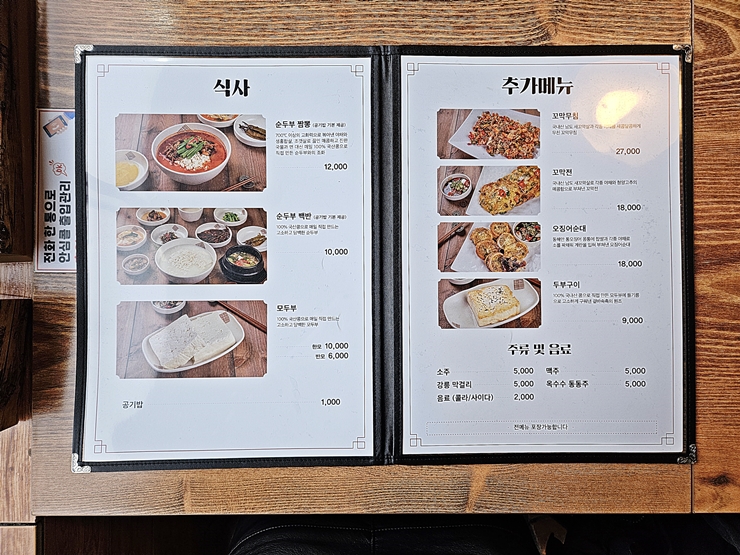 메뉴. 순두부 짬뽕, 순두부 백반, 모두부, 꼬막무침, 꼬막전, 오징어 순대와 두부 구이를 판매하고 있다. 우리는 다양한 메뉴를 맛보기 위해서 순두부 백반, 꼬막무침과 오징어 순대를 주문했다. 꼬막무침과 오징어 순대는 제대로 된 술 안주이지만 차를 가지고 오기도 했고 다음 일정이 있었기 때문에 술은 마시지 않기로 했다. 흑흑흑. 이곳에서 소주 한 잔 제대로 하고 싶구나.