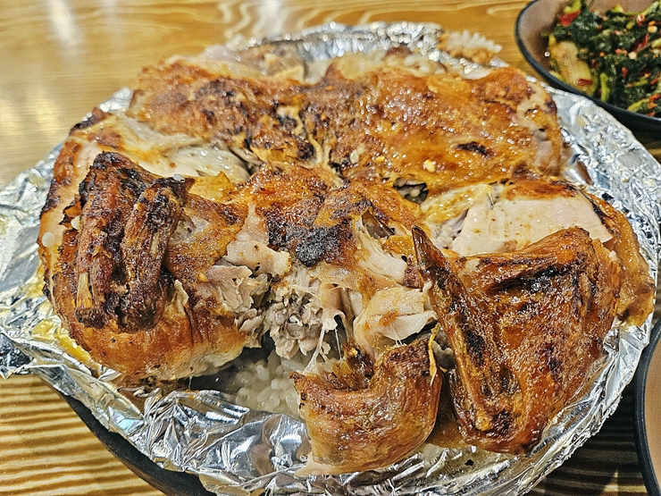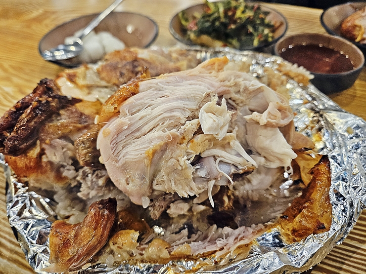 아름다운 모습의 닭 장작구이. 아아, 참으로 황홀한 모습이 아닐 수 없다. 큼지막한 닭을 사용하는데 그 모습이 실로 압도적이다. 닭 장작구이 안에는 찹쌀이 들어 있는데 이게 또 제대로 된 별미다. 나는 닭다리보다 가슴살을 좋아하기 때문에 닭다리는 양보하고 가슴살을 공략하기로 했다. 역시 지인을 배려하는 멋진 나.