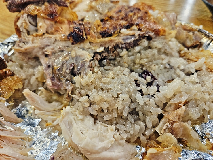 큼직한 닭임에도 불구하고 가슴살이 촉촉하고 부드럽다. 닭 가슴살이 질기고 퍽퍽하다는 편견은 이제 없어져도 좋다. 이 닭가슴살을 소스에 찍어 먹어도 좋고 소금에 찍어 먹어도 좋고 그냥 먹어도 좋다. 어떻게 먹어도 참 맛있다. 찹쌀에 양념이 가미 되어 있는데 이 양념이 살에도 스며 들어 참으로 풍부한 풍미와 감칠맛을 느낄 수 있다.