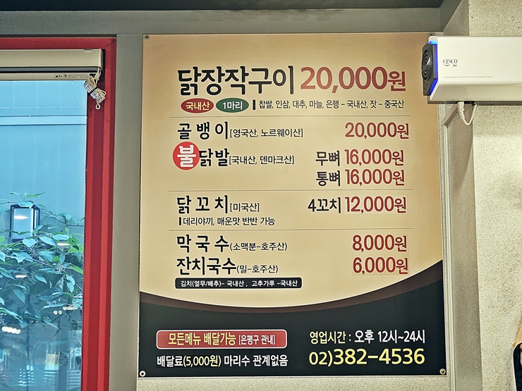 메뉴. 신호등 장작구이의 시그니처 메뉴라고 할 수 있는 닭 장작구이와 함께 골뱅이, 불닭발, 닭꼬치, 막국수와 잔치국수를 판매하고 있다. 닭발은 취향을 고려하여 무뼈 닭발과 통뼈 닭발로 구분해서 판매한다. 예전에 방문했을 때도 이렇게 메뉴가 많았었나 싶다. 우리는 닭 장작구이와 막국수를 주문했다. 다른 메뉴는 굳이 여기서 먹지 않아도 될 것 같기 때문이다.