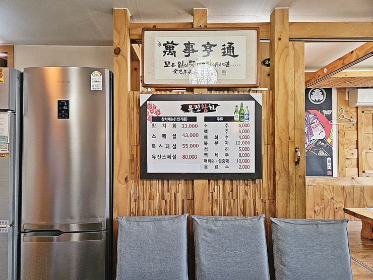 메뉴. 참치는 어느 부위가 나오는 지에 따라 가격이 달라진다. 33,000원부터 80,000원까지 가격이 형성 되어 있다. 요새 참치는 기본이 50,000원부터 시작하는 곳이 많은데 참으로 합리적인 가격이 아닐 수 없다. 또한 소주와 맥주가 4,000원이라는 아름다운 가격을 자랑한다. 요새 강남에 가면 6,000원인 곳도 있는데 이런 가격을 보면 술을 마시지 않을 수 없지. 우리는 특스페셜을 주문했다.