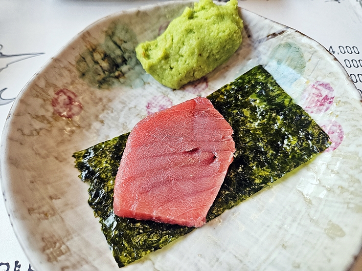 참치를 김과 함께 먹는 것을 별로 좋아하지 않지만 예쁜 사진을 찍기 위해서 김에 올린 후 사진을 찍고 참치만 먹었다. 내가 좋아하는 붉은 살부터 공략 하기로 한다. 해동을 잘 해서 사각 거리는 식감은 느낄 수 없었고 부드러운 식감만 느꼈다. 질이 좋지 않은 붉은 살의 경우 살에서 살짝 신 맛이 나는데 그런 불쾌한 맛도 느낄 수 없었다. 아, 이 집 정말 좋구나.