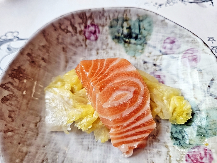 백김치 밑에 와사비를 넣고 연어를 올려 맛있게 냠냠. 제대로 된 소주 안주다. 소주 한 잔 마시고 이 조합을 한 입에 넣어 먹으면 소주의 쓴 맛이 싹 사라진다. 이날의 주역은 참치였기 때문에 무작정 먹을 수 없는 것이 아쉬웠지만 아쉬움을 뒤로 하고 차분하게 다음 요리가 나오길 기다렸다. 역시 언제나 냉정함과 차분함을 잃지 않는 멋진 나.