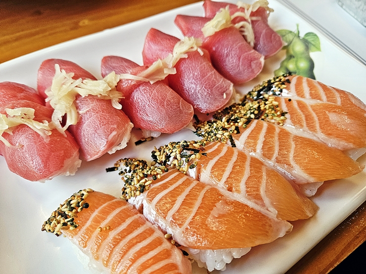 초밥. 참치 붉은 살과 연어를 사용해서 만들었다. 난 참치 붉은 살을 상당히 좋아하는 편이다. 참치 특유의 기름기가 적긴 하지만 그만큼 담백함을 느낄 수 있다. 참치 위에는 생강을 올렸고, 연어에는 후리카케를 올렸다. 탄수화물을 줄이기 위해 노력하고 있지만 술을 마실 때 이런 초밥 한 점 정도는 괜찮지. 하지만 한 점만 먹지 않은 것이 함정이다.