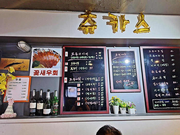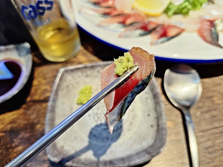 우리가 도착했을 때 내부는 이미 만석이어서 내부 사진을 찍지 못했다. 그래서 메뉴만 사진을 찍었다. 고등어 회, 갈치 회, 전갱이 회, 삼치 회, 청어 회, 단새우 회와 갯방어 회 등 다양한 회를 판매하고 있다. 거기에 고등어 조림, 구이, 알탕, 서더리, 해물라면, 문어 숙회, 갑오징어 숙회, 시샤모 구이와 삼치 구이도 판매하고 있다. 우리는 고등어 회와 갈치 회가 함께 나오는 세트를 주문했다. 제주바당은 수조가 있어서 고등어를 활어로 먹을 수 있고, 갈치는 선어로 먹을 수 있다.