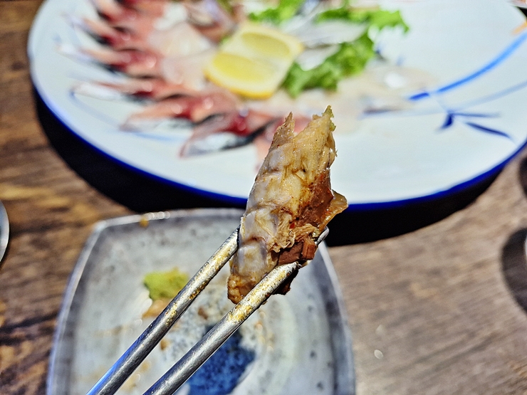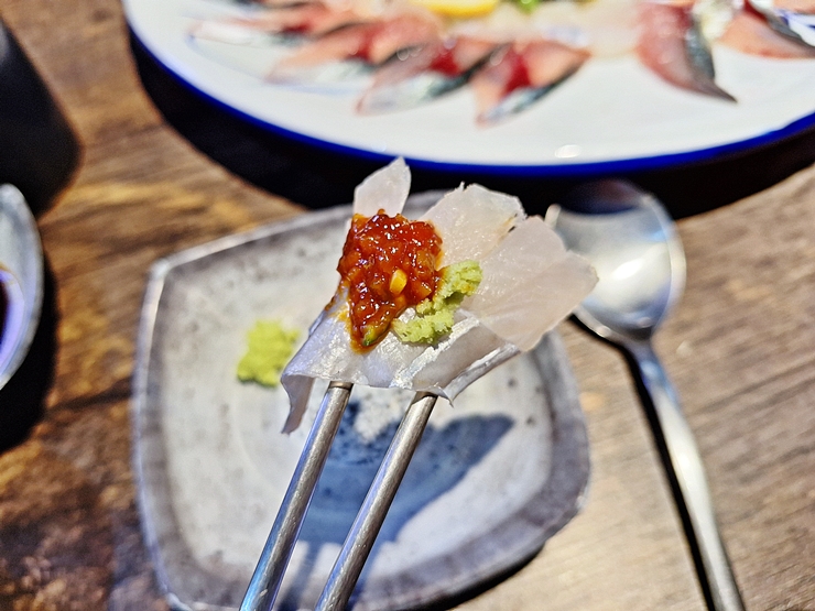 기본으로 나오지만 맛이 상당히 좋은 고등어 조림. 무, 고추와 함께 몽실몽실 잘 졸였다. 이렇게 잘 졸인 고등어 조림은 그 체로도 훌륭한 밥 반찬이자 술 안주가 된다. 우리는 밥을 먹지 않고 술을 마셨기 때문에 술 안주로 즐겼지. 고등어 조림은 리필이 되지 않고 추가 요금을 내야 한다. 고등어 회를 먹기 때문에 굳이 리필은 하지 않았다.