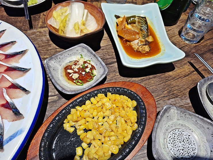 내가 좀 늦게 도착해서 이미 메뉴가 다 나와 있었다. 기본 반찬으로는 콘, 고등어 조림, 백김치와 쌈장이 나온다. 쌈장은 고등어 회와 함께 곁들여도 좋고, 갈치 회와 곁들여도 좋다. 콘은 없어도 되는데 막상 없으면 서운하고 아쉽고 가슴이 시리고 얼굴에 주름이 깊게 진다. 난 콘을 거의 안 먹는데도 불구하고 항상 이런 마음이 드는 것이 탈이다.