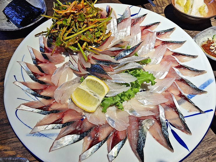 아름다운 모습의 고등어 회와 갈치 회. 제주에서 접한 것과 동일한 감동을 준다. 내륙에서 고등어 양식이 되지 않을 때는 이런 고등어 회를 먹으려면 상당히 비싼 값을 지불하고 먹어야 했는데, 이제는 양식이 되고 빠르게 운송을 할 수 있기 때문에 가격이 많이 낮아졌다. 이것이 바로 긍정적인 발전이라 할 수 있다.