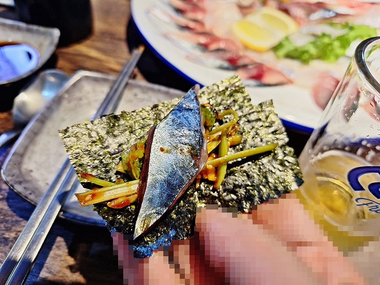그냥 먹어도 맛있지만 이렇게 김과 미나리와 함께 즐겨도 좋다. 미나리와 고등어의 궁합은 복과 미나리처럼 검증이 되었기 때문에 무작정 즐길 수 있다. 미나리의 아삭한 식감이 고등어와 굉장히 잘 어울린다. 지인과 진지한 이야기를 하였지만 고등어 회를 맛있게 즐기니 어느덧 취기가 올라왔다. 녀석도 어느 정도 술을 마시니 빠르게 진지한 이야기를 끝내고 일상 넋두리를 하는 시간으로 바뀌었다.