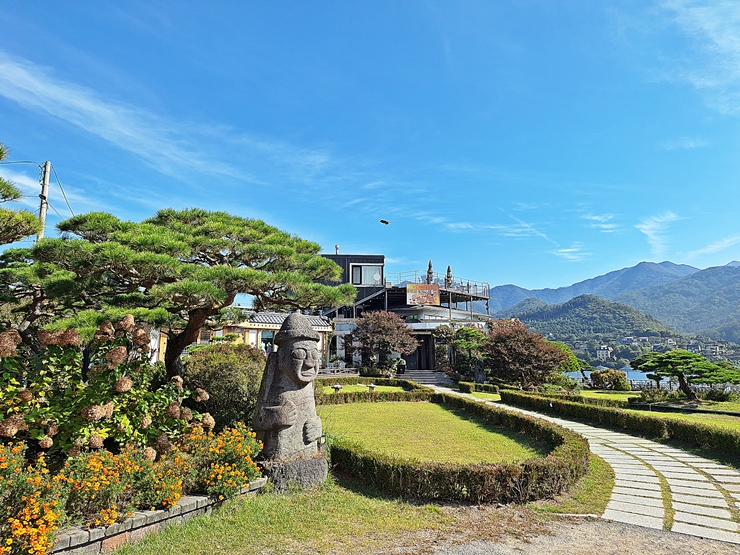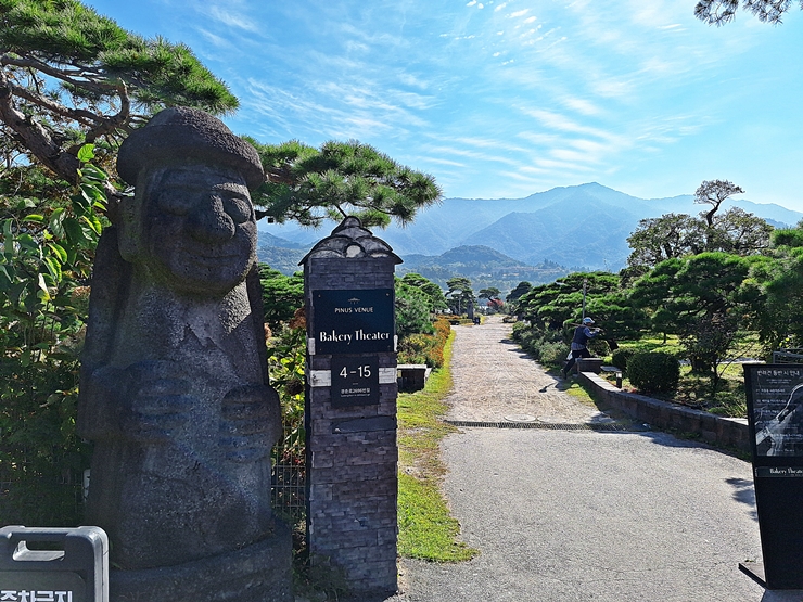 굉장히 넓은 베이커리 씨어터. 정원이 정말 잘 정리 되어 있다. 정원 곳곳에 돌하르방이 서있는데 대체 왜 돌하르방이 있는지 모르겠다. 제주의 기분을 느껴보라는 것인가. 짝꿍이 블로그에서 날씨가 좋을 때는 야외에 앉기 힘들다는 것을 봤다고 말하며 자리를 잡은 후 카페 내부로 들어가자고 한다. 풍경 좋은 곳에서 커피를 마시는 것이 좋기 때문에 짝꿍 말을 듣고 빠르게 자리를 찾았다.