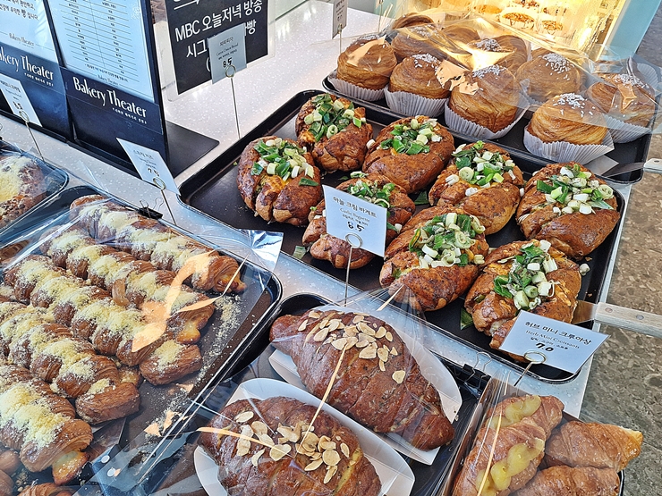 어쩌고 빵, 허브 미니 크로아상, 마늘 크림 바게트와 대파 어쩌고 빵. 대파 어쩌고 빵은 향이 굉장히 좋아서 하나 주문해서 먹을까 잠시 고민을 했지만 점심은 다른 곳에서 먹기로 했기 때문에 그냥 짝꿍과 샌드위치 하나 사서 나눠 먹기로 했다. 철저히 식단 조절을 잘 하는 멋진 나. 다른 쪽에도 여러 빵이 있었는데 올리는 것이 귀찮아서 생략 하기로 한다.