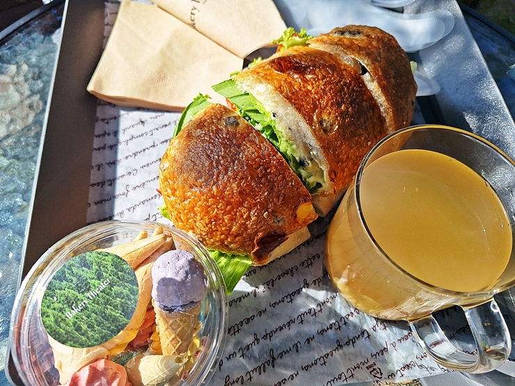 우리가 주문한 바질 페스토 샌드위치, 유자차와 아메리카노. 짝꿍이 아메리카노를 들고 있어서 사진에 찍히지 않았네. 맨 아래 나온 머랭 스틱은 리뷰 이벤트로 받은 것이다. 머랭 스틱을 마치 아이스크림처럼 만들었는데 모양이 상당히 귀여웠다.