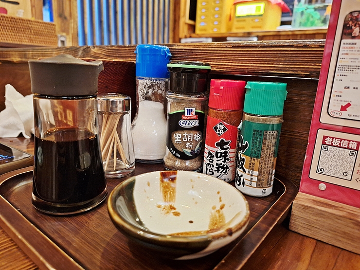 시치미를 비롯해서 후추, 소금, 산초가루와 간장도 있다. 일본 이자카야에서 볼 수 있는 것들은 모조리 다 때려 부은 느낌이다. 이런 것은 딱히 중요하지 않지만 그냥 생색 한 번 내려고 사진을 찍었다.