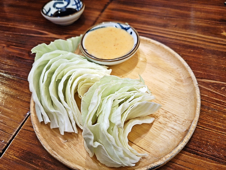 이런 저런 메뉴를 주문하고 나오는 기본 반찬인 양배추. 양념이 가미 된 마요네즈와 함께 나온다. 이런 양배추는 간장에 찍어 먹어도 맛있고 소스에 찍어 먹어도 맛있고 마요네즈에 찍어 먹어도 맛있다. 양배추를 먹으며 출장 내용을 다시 정리했다. 언제나 정리를 잘 하는 멋진 나.