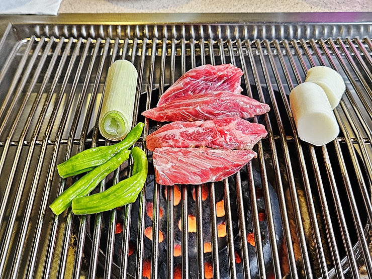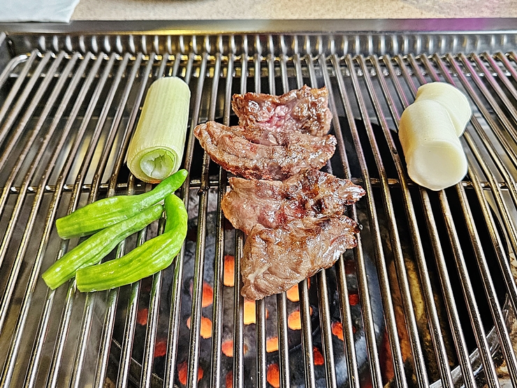갈빗살부터 굽도록 한다. 갈빗살과 함께 떡, 파와 꽈리고추를 올려서 굽는다. 이제는 상식이 된 내용으로써 소고기는 너무 과하게 굽는 것은 좋지 않고 적당히 구워 먹는 것이 맛있다. 하지만 이런 상식보다 각자의 취향이 더욱 중요하기 때문에 어느 정도 익었다 싶으면 그 후에는 각자 타겟을 정하고 구워 먹으면 좋다.