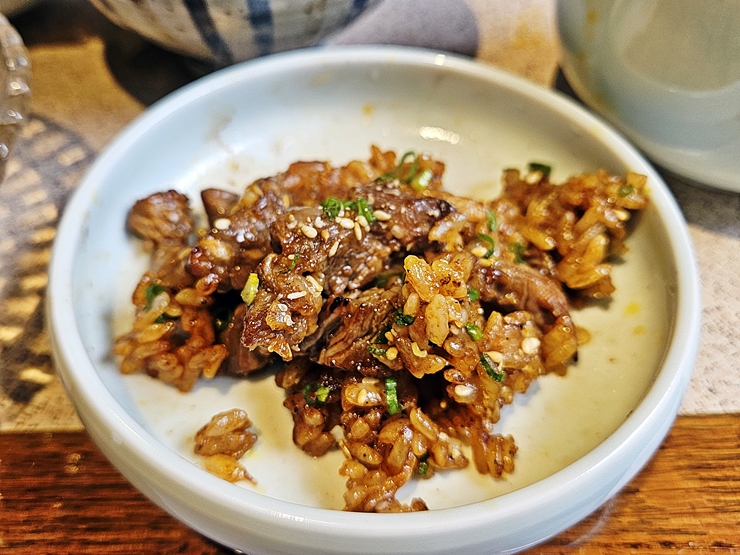 흔쾌하게 계란을 지인에게 양보하고 난 갈비를 양껏 취했다. 이것이 바로 살을 주고 뼈를 취하는 작전이라 할 수 있지. 후후후. 갈비 볶음밥에는 갈빗살이 상당히 많이 들어 있는데, 갈빗살이 과하게 익지 않고 적당하게 익어 상당히 맛이 좋았다. 고기를 먹을 때 탄수화물 섭취를 최대한 자제하고 있지만 이날은 좀 과하게 먹었다. 반성해야지. 자, 반성 끝. 다시 이제 고기를 먹어보도록 해야겠다. 경복궁역 근처에서 고즈넉한 분위기를 즐기며 맛있는 한우를 먹고 싶다면 한 번 방문할 것을 추천하는 곳이다.