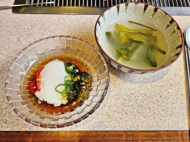 수란과 동치미. 수란을 소스 삼아서 고기에 찍어 먹어도 좋고 그냥 먹어도 좋다고 한다. 난 고기 자체의 풍미를 즐기는 편이기 때문에 수란은 따로 먹기로 했지. 동치미 국물이 상당히 맛있었다. 동치미를 마시면 소화가 잘 된다고 하는데, 난 원래 소화를 잘 하는 편이니 동치미를 먹으면 더욱 소화가 잘 될 거 같고 고기를 더 많이 먹을 수 있을 거 같아서 동치미를 꿀껄꿀꺽 마셨다.