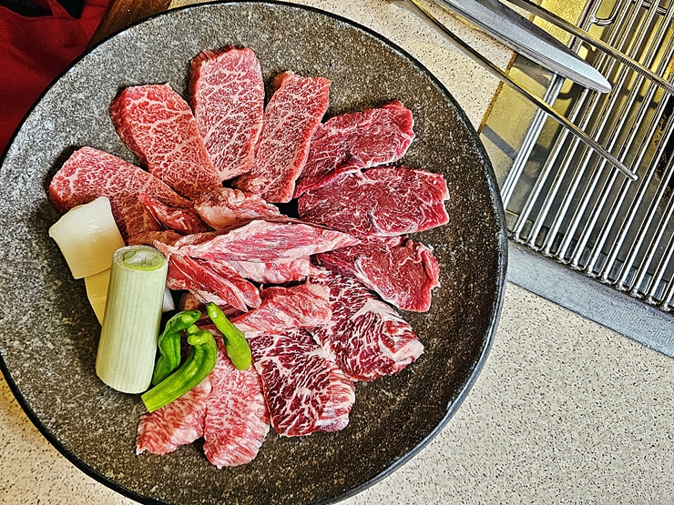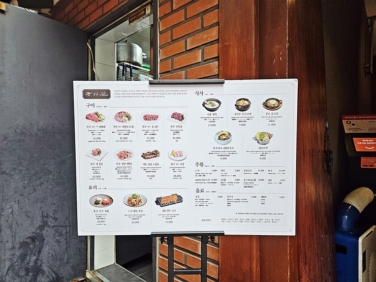 메뉴. 다양한 한우 부위를 판매하고 있고, 식사류로 떡국, 된장찌개, 볶음밥과 해장 라면도 판매하고 있다. 단품 요리로는 육회, 스지 냉채 무침과 더덕 구이도 판매하고 있다. 우리는 다양한 부위를 즐기기 위하여 모둠을 주문했다. 난 고기 중에서 양고기를 가장 좋아하고, 소고기를 가장 좋아하지 않기 때문에 메뉴 선택권은 지인에게 넘겼다.