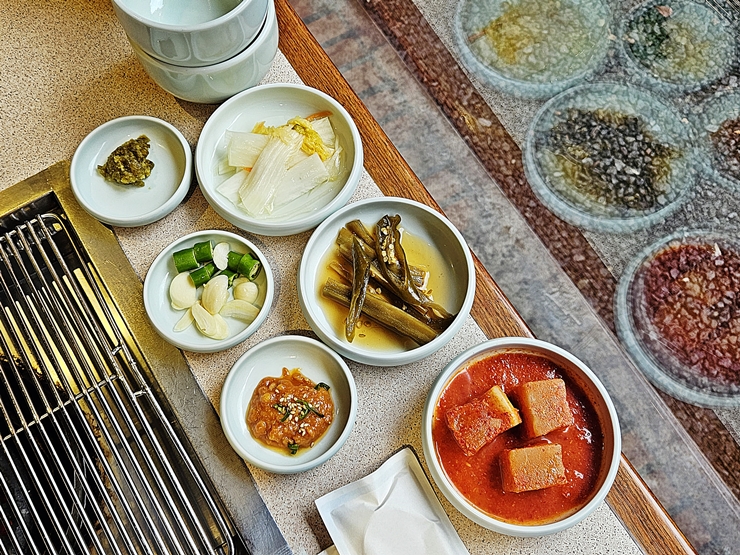 반찬. 의외로 백김치가 가장 맛있었다. 고기 반찬이 나오지 않는 것이 흠이지만, 고기를 먹으러 왔으니 고기 반찬은 없어도 좋다. 이런 반찬을 많이 먹으면 고기를 배불리 먹을 수 없으니 적당히 먹고 어서 고기가 나오길 정갈한 모습으로 기다렸다. 역시 언제 어디서 누구와 어떻게 있어도 정갈한 모습을 잘 갖추는 멋진 나.