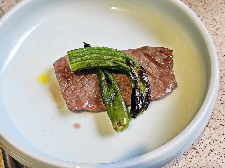 잘 구워진 꽈리고추와 함께 사진을 찍고 고기는 고기 따로, 꽈리고추는 꽈리고추 따로 먹었다. 소금을 살짝 찍어 먹으니 소고기 특유의 눅진한 지방 맛이 확연히 느껴진다. 첫 맛은 참으로 좋지만 이내 물리는 것이 아쉽다. 하지만 물릴 때 하이볼을 한 모금 마시니 입 안의 기름기가 싹 사라진다. 역시 하이볼을 주문한 것은 탁월한 선택이었다. 다양한 부위의 고기를 구웠는데 다 올리기는 귀찮으니 생략 하기로 한다. 전체적으로 고기의 퀄리티가 굉장히 좋다.