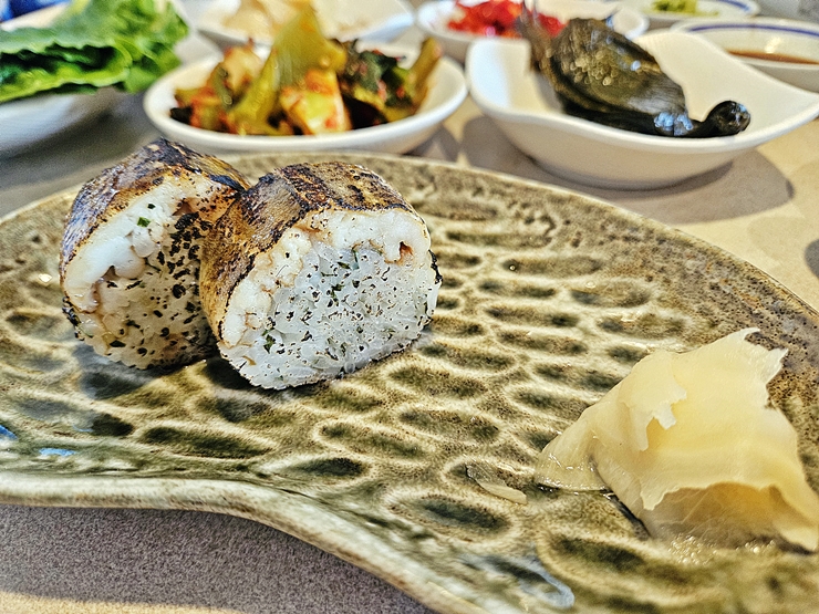 아름다운 모습의 소금 장어 구이. 아아, 비록 고기는 아니지만 충분히 아름답고 황홀한 모습이다. 숯불이 아닌 가스 불로 굽는 것이 사소한 단점이지만, 그런 단점은 쉽게 넘어갈 수 있다. 장어만 굽는 것은 아니고 장어와 함께 먹으면 아주 좋은 가니쉬도 함께 제공한다. 가니쉬는 지인에게 양보하고 나는 장어에 집중을 하려고 했는데, 지인도 나와 같은 생각을 하고 있어서 결국 사이 좋게 나눠 먹었다.