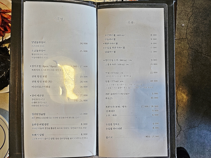 메뉴. 장어 전문점이기 때문에 장어를 메인으로 하는 요리가 많고 그 밖에 보쌈도 판매하고 있다. 우리는 먼저 소금 돌판 장어 구이와 함께 장어 초밥을 주문했다. 장어는 많은 사람들이 알고 있는 것처럼 기력 회복에 참 좋은 재료이기 때문에 많이 먹으면 먹을수록 좋다. 몸에 좋고 맛도 좋은 장어. 먹을 수 있을 때 마음껏 먹도록 하자.