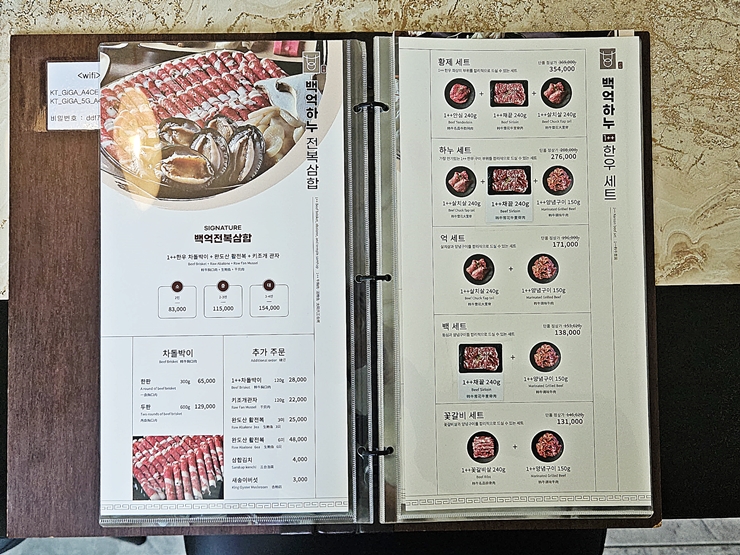 메뉴. 우아한우(백억하누)는 차돌전복삼합을 시그니처 메뉴로 내세우고 있다. 그렇다면 시그니처 메뉴를 먹어야지. 인원 수에 따라 알맞게 주문을 하면 된다 그 밖에 꽃등심, 살치살과 갈빗살이 함께 나오는 세트도 준비 되어 있다.