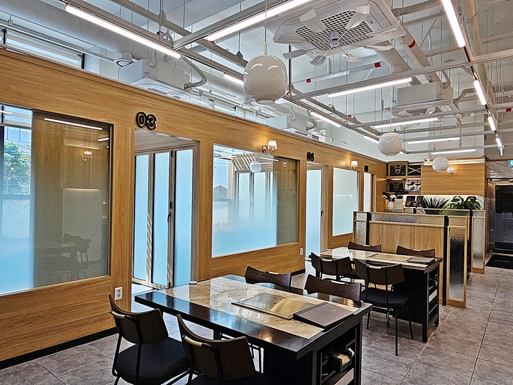 깔끔한 내부 모습. 룸도 따로 준비 되어 있어서 미팅이나 회식을 하기에도 좋다. 우리가 방문했을 때는 따로 룸으로 예약을 하고 갔다. 방음이 완벽하게 되진 않지만 그래도 다른 고객들과 구분을 하며 식사를 할 수 있는 점이 좋았다.