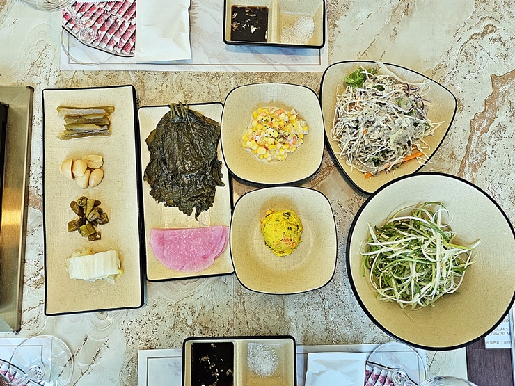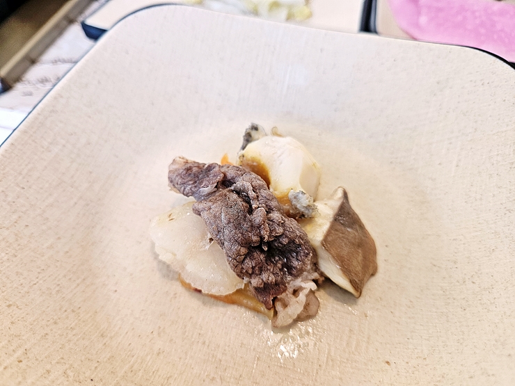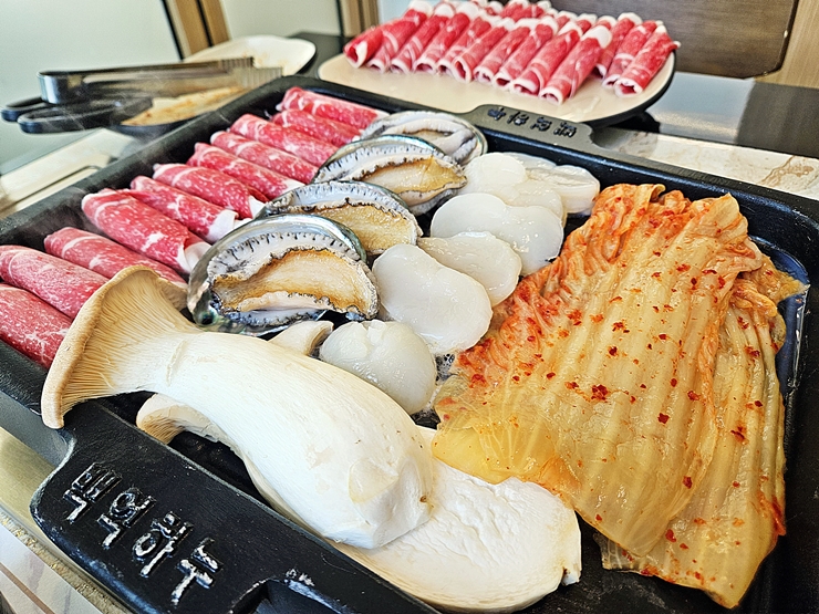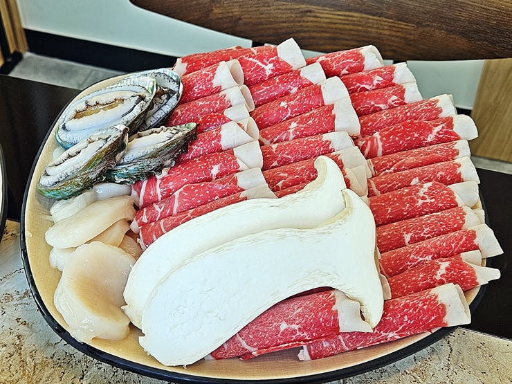 아름다운 차돌전복삼합의 모습. 참으로 아름다운 모습이 아닐 수 없다. 한우 차돌박이, 새송이 버섯, 전복과 관자가 나온다. 삼합은 직원이 직접 구워 주기 때문에 편하게 식사를 할 수 있다.