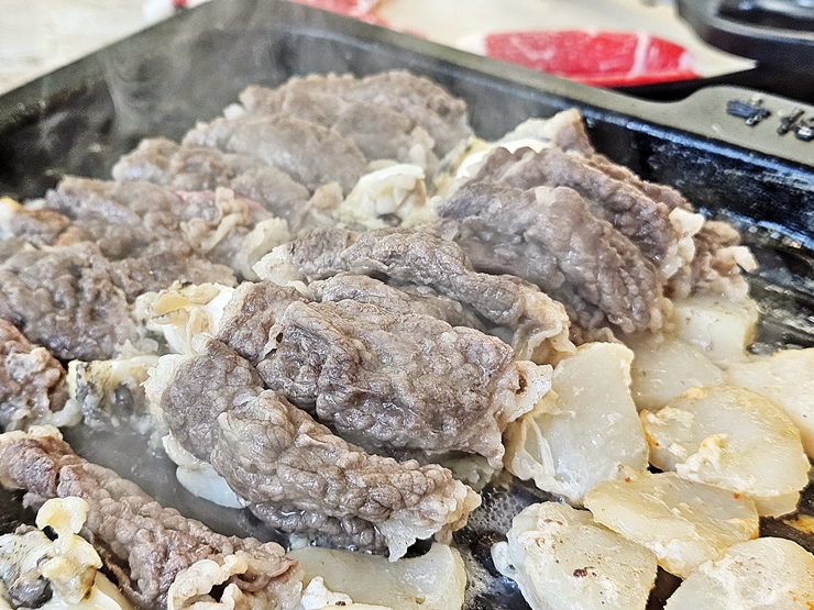 불판에 올렸을 때 모습도 아름답지만, 이렇게 잘 구워진 모습은 더욱 아름답지. 차돌은 굉장히 빠르게 구워지기 때문에 금방 먹을 수 있는 장점이 있다. 흐름이 끊기지 않게 계속 구우면서 끊임 없이 먹으면 된다.