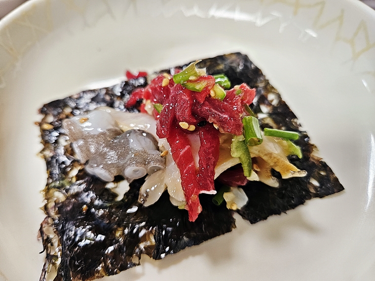 탕탕이는 이렇게 숟가락으로 퍼먹어도 되고 젓가락으로 떠 먹어도 된다. 손으로 집어 먹지만 않으면 된다. 난 사진을 찍기 위해서 숟가락으로 뜬 후 개인 그릇에 옮긴 후 젓가락으로 그냥 먹기도 하고 김과 함께 싸서 먹기도 했다. 먼저 탕탕이 본연의 맛을 느끼기 위해 그냥 먹었다. 고소한 맛이 강하게 나면서 전복과 낙지 본연의 맛도 잘 느껴진다. 이런 조합은 대체 누가 어디서 언제 어떻게 왜 발견하게 되었을까. 누구인지 모르겠지만 깊은 감사를 표한다.