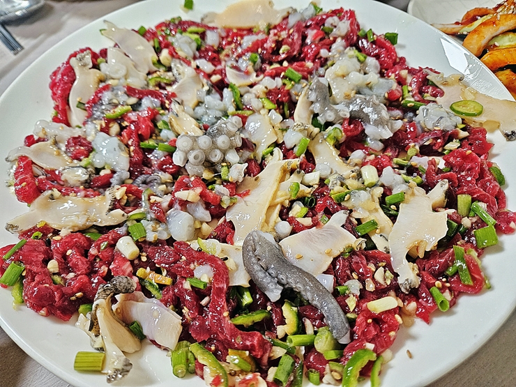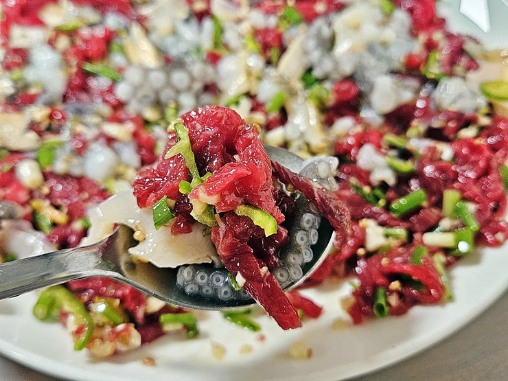 참으로 아름다운 모습의 탕탕이. 너란 녀석은 왜 볼 때마다 아름답게 느껴질까. 도무지 질리지 않는 모습이다. 탕탕이 안에는 소고기, 낙지, 전복, 쪽파와 고추가 들어 있다. 쪽파와 고추가 맛에 기분 좋은 변화를 줘서 물리지 않고 계속해서 먹을 수 있게 하는 고마운 역할을 한다.