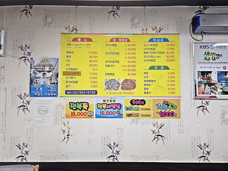 메뉴. 전복, 소고기와 낙지로 구성된 탕탕이가 특특대, 특대, 3인,과 2인 구성으로 되어 있다. 낙지만 탕탕이로 먹을 경우 시가라고 한다. 그 외에 산낙지볶음, 산낙지연포탕, 산낙지초무침, 전복구이, 전복볶음, 소고기비빔밥, 낙지비빔밥, 뚝배기전복+연포탕, 코다리찜,소낙비빔밥, 전복죽과 전복 비빔밥을 판매하고 있다. 우리는 당연히 전복 소고기 낙지 탕탕이를 주문했다.