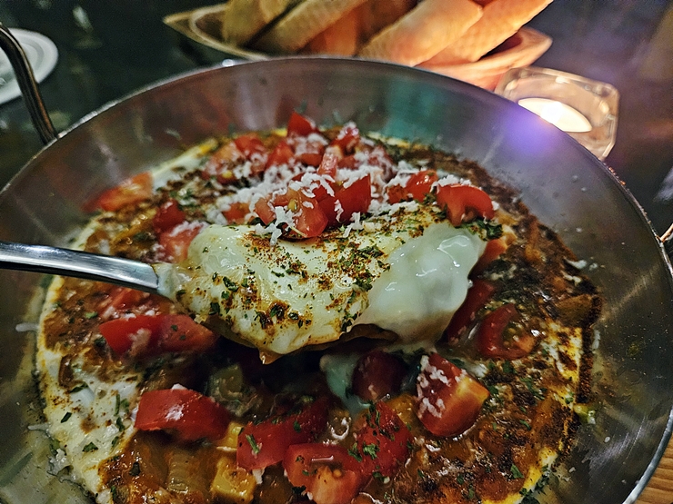 가운데에 계란이 들어 있는데 반숙을 잘 유지하고 있다. 사진을 찍기 위해서 이렇게 잠시 올린 것이고 노른자를 피해 잘 비빈 후 바게트 위에 올려 먹었다. 최근 들어서 먹은 삭슈카 중에서 가장 수준이 높다고 느꼈다. 샥슈카를 평범하게 만드는 곳 같은 경우 토마토를 넣지 않고 그냥 토마토 소스만 이용하는 곳이 많은데, 비스트로 혜화 같은 경우 토마토도 아낌 없이 넣어 식감이 좋았다.