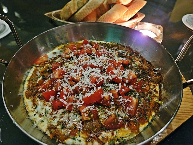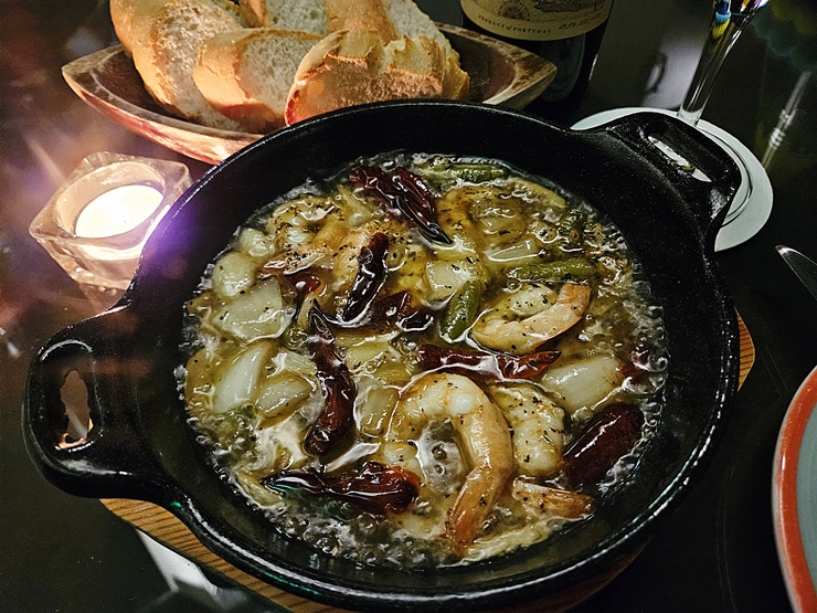 분명 사진을 많이 찍은 것 같은데 사진이 거의 없네. 아쉽지만 이번 포스팅은 기록하는 것에 의미를 둬야겠다. 어쩌고 와인도 주문을 했는데 사진이 없어서 기억이 나지 않는다. 가장 먼저 주문한 것은 감바스. 감바스야 뭐 이제 전국 어딜 가더라도 수준 높은 것을 즐길 수 있다. 중국집의 볶음밥이 전국적으로 하향 평준화가 되었다면, 감바스는 전국적으로 상향 평준화가 된 대표적인 음식이 아닐까 싶다. 함께 제공되는 바게트에 올려 먹어도 되고 그냥 먹어도 된다. 품질이 좋은 올리브유를 가득 쓰고 그 안에 고추를 넣어 느끼한 맛을 잘 잡았다.