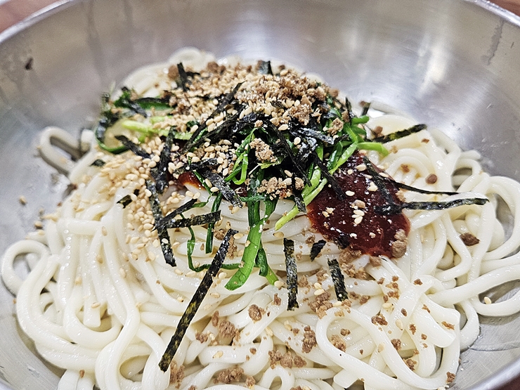 냉비빔국수의 모습. 칼국수에 소량의 고기, 양념장, 부추, 김가루와 깨가 올라가 있다. 야무지게 슥슥 비벼서 먹으면 된다고 한다. 오른손으로 비벼도 좋고 왼손으로 비벼도 좋다. 고기를 굽는 것은 나의 몫이지만 비비는 것은 나의 몫이 아니니 일행에게 비비는 것을 허락했다.