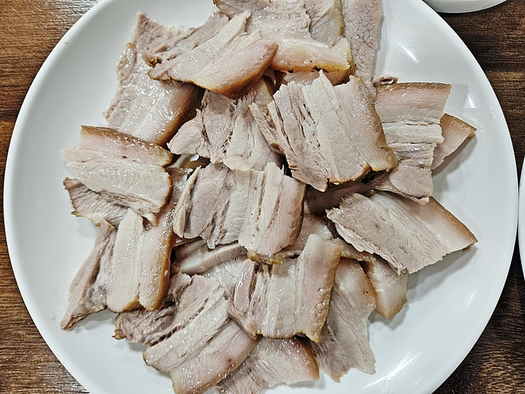 참으로 아름답고 고운 수육의 모습. 수육은 삼겹살 부위를 사용하는데 잡내가 전혀 나지 않고 돼지고기 특유의 고소함이 잘 느껴진다. 참으로 올바르고 바람직한 수육의 모습이 아닐 수 없다. 이런 수육에는 소주 한 잔 딱 걸쳐야 하는데 운전을 해야 하기 때문에 술을 마시지 못했다. 언제나 준법정신을 잊지 않고 모범적으로 살아가는 멋진 나의 모습이다.