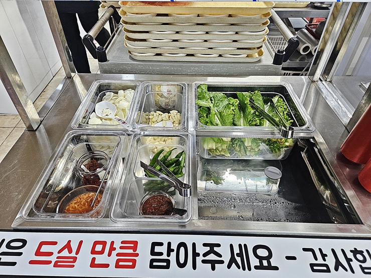 수육을 먹는 사람들을 위해 마늘, 상추, 새우젓과 고추를 마음껏 먹을 수 있도록 셀프 바를 운영하고 있다. 이런 셀프 바에서는 먹을 수 있을 만큼만 담아야 한다. 그래야 음식물 쓰레기가 나오지 않고 환경을 보존을 할 수 있다. 언제나 환경을 생각하는 멋진 나.