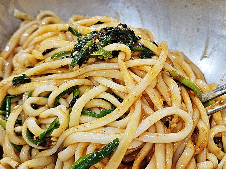 야무지게 잘 비벼진 냉비빔국수의 모습. 냉비빔국수는 그냥 평범한 비빔 칼국수의 맛이었다. 같이 간 일행은 양념장이 상당히 맛이 좋다고 하는데, 내 입에는 특별한 맛을 느낄 수 없었다. 일행은 워낙 면에 조예가 깊고 면을 좋아해서 그런 것 같다.