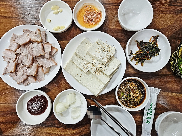 수육과 두부의 아름다운 모습. 반찬은 찍기 귀찮아서 한 번에 그냥 항공 샷으로 찍었다. 이 사진을 찍으니 바로 냉비빔국수가 바로 나왔다. 냉 비빔국수는 탄수화물이니 굳이 항공 샷에 없어도 될 거 같아서 다시 사진을 찍지 않았지. 진수성찬이 차려졌으니 이제 맛있게 먹을 일만 남았다.