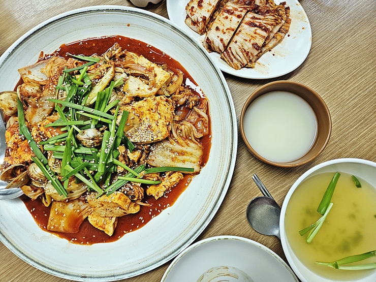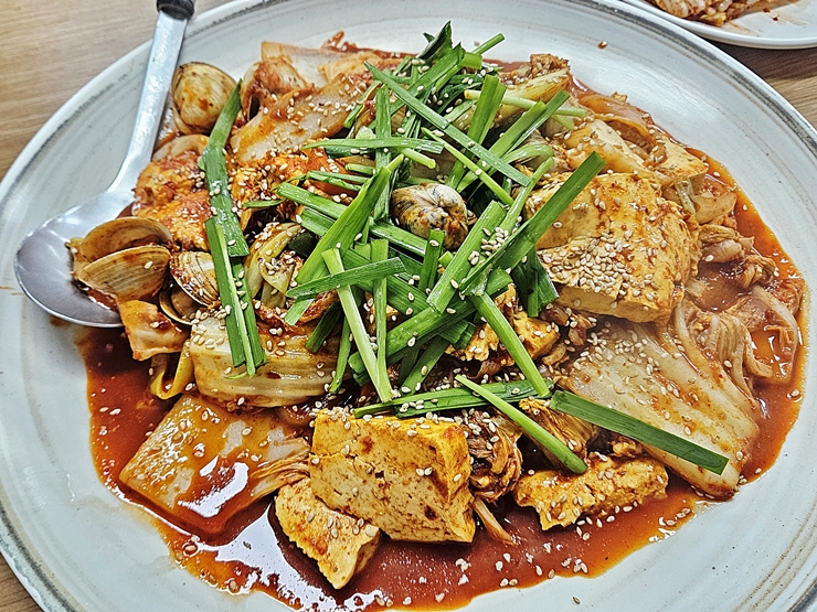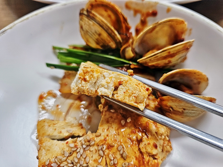아름다운 모습의 두부 두루치기. 두부, 배추, 조개와 부추가 수북하다. 참으로 아름다운 모습이 아닐 수 없다. 두부 두루치기가 상당히 매콤할 것 같은 느낌인데 괜찮다. 막걸리가 있으니 말이다. 양도 상당한데 2인분의 양이 아니라 마치 3인분의 양으로 느껴졌다.