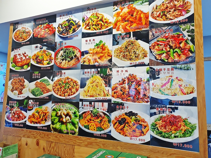 메뉴. 메뉴판을 찍으려고 했는데 귀찮아서 그냥 벽에 붙어 있는 음식 사진을 찍었다. 양꼬치, 양갈비와 더불어 마파두부, 지삼선 동파육, 라즈지, 어향가지, 숙주볶음과 고추잡채 등 다양한 중국 요리를 판매하고 있다. 우리는 일단 양꼬치 2인분과 함께 지삼선을 주문했다.