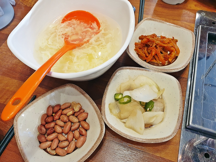 기본 반찬. 계란국, 볶은 땅콩, 양파 장아찌와 짜사이가 나온다. 양꼬치 전문점이 처음 생겼을 때는 대부분의 가게에서 계란국을 무료로 제공을 했는데 이제는 물가가 많이 올라서 제공을 하지 않는 곳이 더 많다. 오랜만에 이런 계란국을 서비스로 받으니 기분이 좋았다. 맛은 그냥 평범한 계란국 맛이었다.