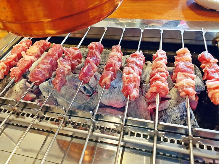 전국 어디를 가더라도 쉽게 볼 수 있는 자동 화로. 톱니처럼 생긴 양꼬치를 올리면 알아서 구워지는 형태다. 중앙 부분은 금방 구워지고 바깥 부분은 느리게 구워지기 때문에 타이밍을 맞춰서 한 번 자리를 옮겨야 한다.
