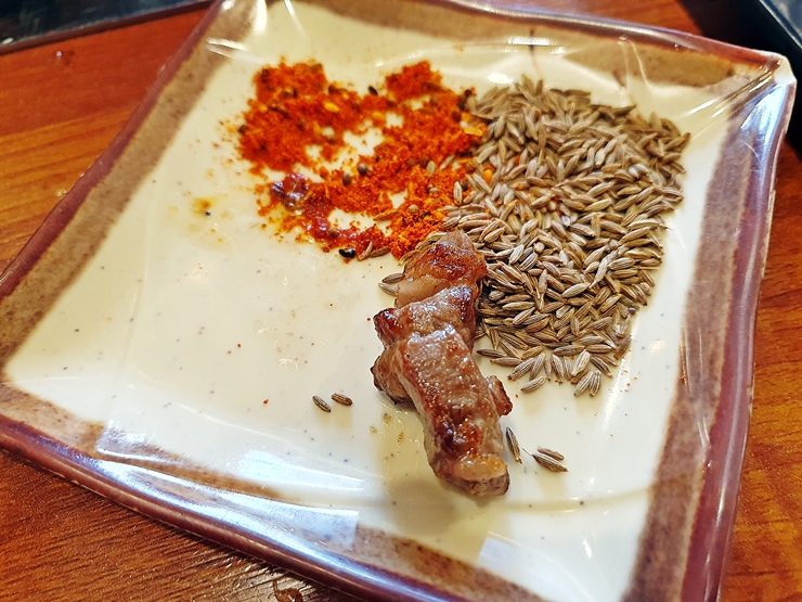 중간 과정은 귀찮아서 생략한다. 잘 익은 양꼬치를 화로 위로 옮긴 후 맛있게 먹으면 된다. 난 쯔란을 굉장히 좋아하기 때문에 쯔란을 듬뿍 찍어 먹는 편이다. 쯔란의 향과 양고기의 풍미가 굉장히 잘 어울린다. 신선한 양고기는 양 특유의 누린내가 나지 않기 때문에 누구나 쉽게 먹을 수 있다.