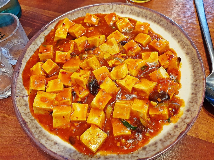 서비스로 받은 마파두부. 서비스임에도 상당히 퀄리티가 좋다. 사천에서 먹는 마파두부와는 다른 맛이고 한국식으로 개량된 한국식 마파두부다. 두반장과 전분을 사용해서 만들었는데 많이 맵거나 짜지 않아서 맛있게 먹을 수 있었다.