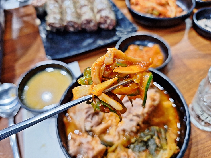 한라산 같이 높이 솟아 오르진 않았지만 중 사이즈라는 것과 가격을 고려하면 실로 놀라운 양이 아닐 수 없다. 큼직한 고기가 무려 여섯 대가 들어 있는데 그 사이즈 역시 엄청나다. 거기에 우거지, 깻잎, 파, 당면 사리와 수제비 등도 충실히 들어있다. 당면 사리를 즐겨 먹지 않는 나에게는 별 다른 감흥이 없었는데 당면 사리가 들어 있는 것을 본 다른 일행은 환호성을 질렀다. 끼얏호.