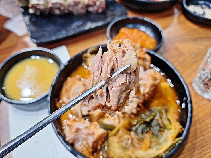 부드럽고 고소한 감자탕. 소스를 살짝 찍어 먹어도 맛있고, 그냥 먹어도 맛있다. 큼직한 고기 한 점에 소주 한 잔을 곁들이면 실로 이곳이 천국이라 느껴진다. 주님, 천국에도 고기는 많겠죠? 계속해서 고기를 먹지만 그 양이 쉽게 줄어들지 않는다. 실로 행복한 일이 아닐 수 없었다.